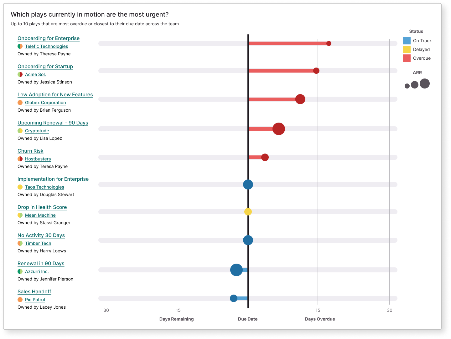 One of our key differentiators in the area of plays is the concept of play performance to enable data-informed improvement of processes. CS leaders needed visibility into how successful existing plays are, as well as awareness of plays currently in process. To meet these requirements, we created a play performance scorecard (which allowed for measuring different versions of a play as these standardized processes evolved), and an overall play performance dashboard, where leaders and individual CSMs could view play instances currently in process.
