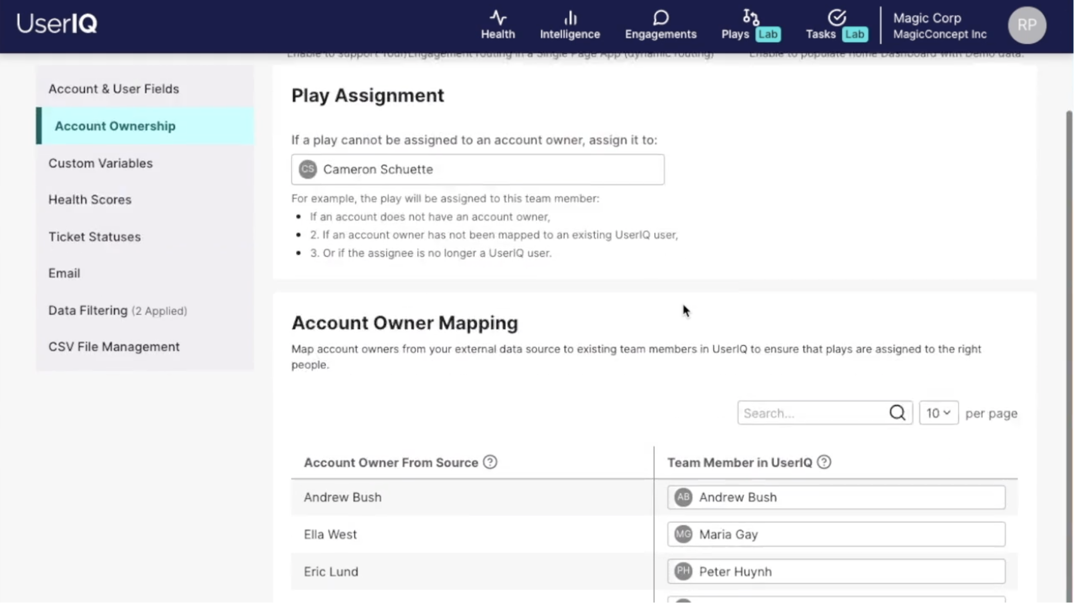 To ensure no play instances fell through the cracks, we also added a default play owner setting and a mapping interface to ensure account owners imported from external data sources corresponded with real people with a UserIQ login.